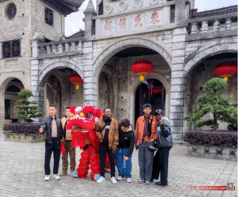 ▲国际友人在朱氏总祠与舞狮合影