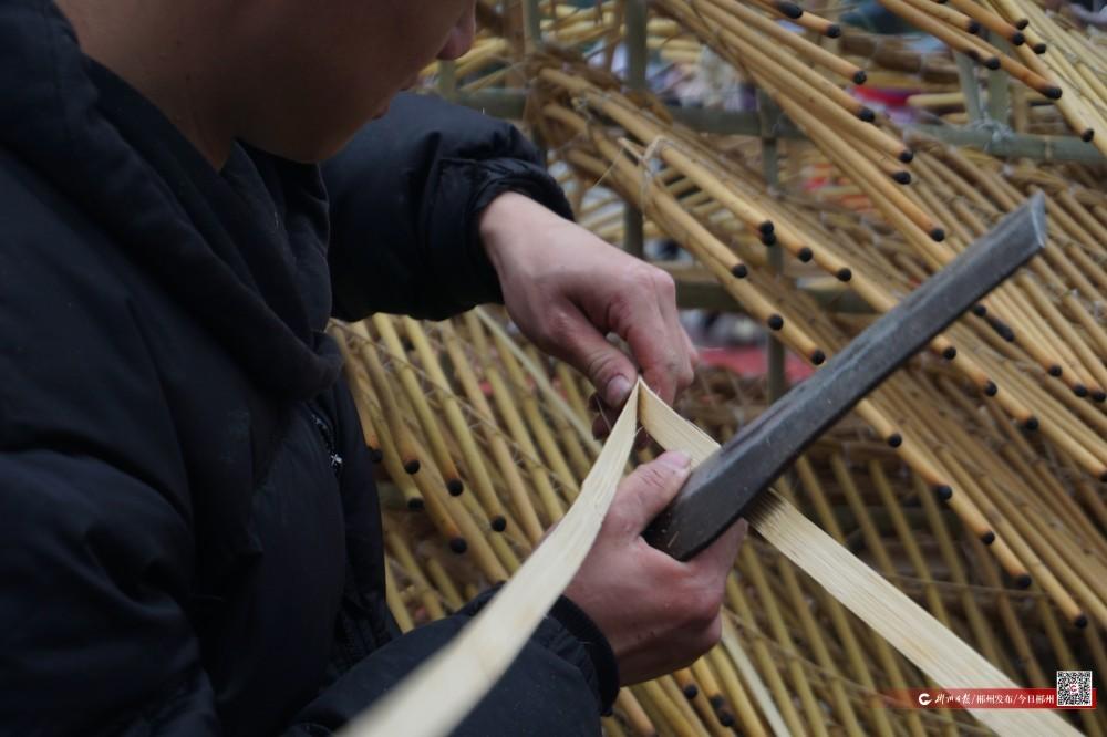 劈开竹条,咬紧牙关,右手用力,将手中数根竹篾旋转拧紧,再穿过龙头与龙身之间,仔细绑好。这样的动作,重复,再重复,直到龙头与龙身紧紧相连。