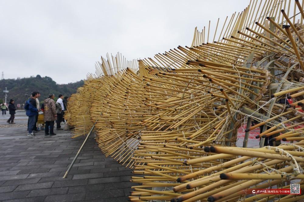 真动起手来,更不容易。稻草绑紧做成的“赵公鞭”,有几百米长,弯曲成型后,成为香火龙的“骨架”;再用竹片固定,从龙头扎至龙颈、龙身、节拱、尾部,添上四爪、龙脊等。选材也得讲究,3到5年的、没有虫蛀的竹子,才能“入选”。