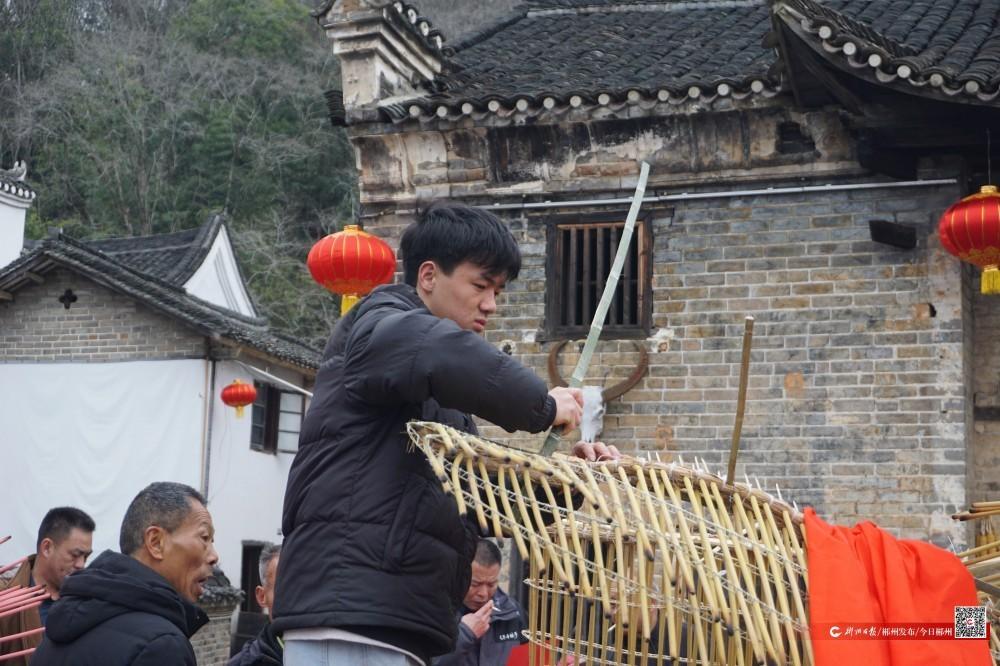2月11日,南方小年。上午,00后朱雄飞受邀带着自己亲手扎的两条香火龙,来到汝城县文明瑶族乡沙洲村,赶在下雨前迅速“组装”,准备参加当晚的小年活动。