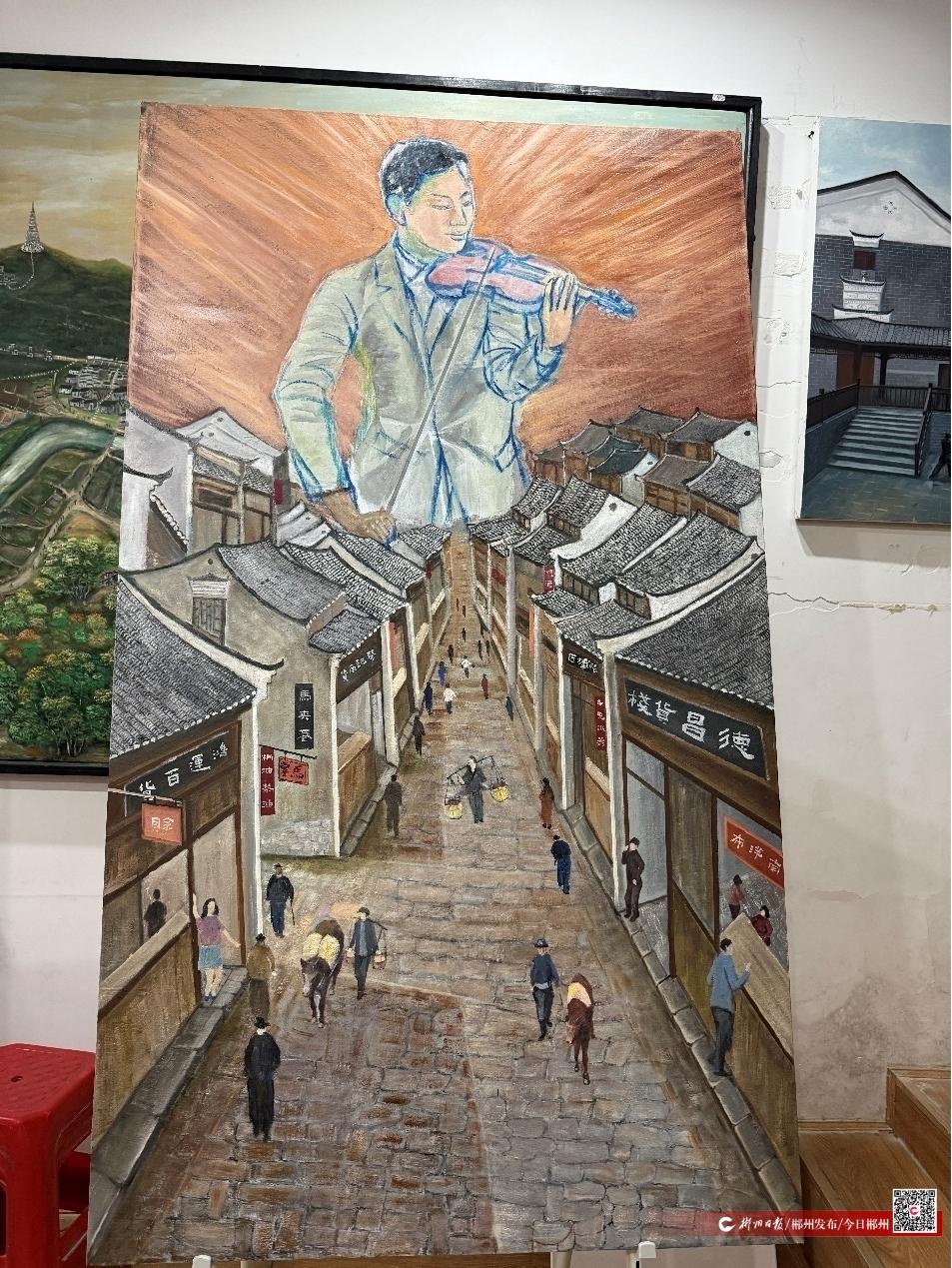 廖宜昌的画室不大,却装得下一条街的千年。墙上密密挂着三十多幅油画,牙石桥、犀牛井、龙骨井、郴州牌楼、江西会馆、米码头、屈原码头、郴阳戏院、东山书院、三观庙……这些建筑有的已不存在,有的在原址上重建,他画记忆里的样子,也画眼前的样子,老街的前世今生都挂在墙上,像两代人的合影。