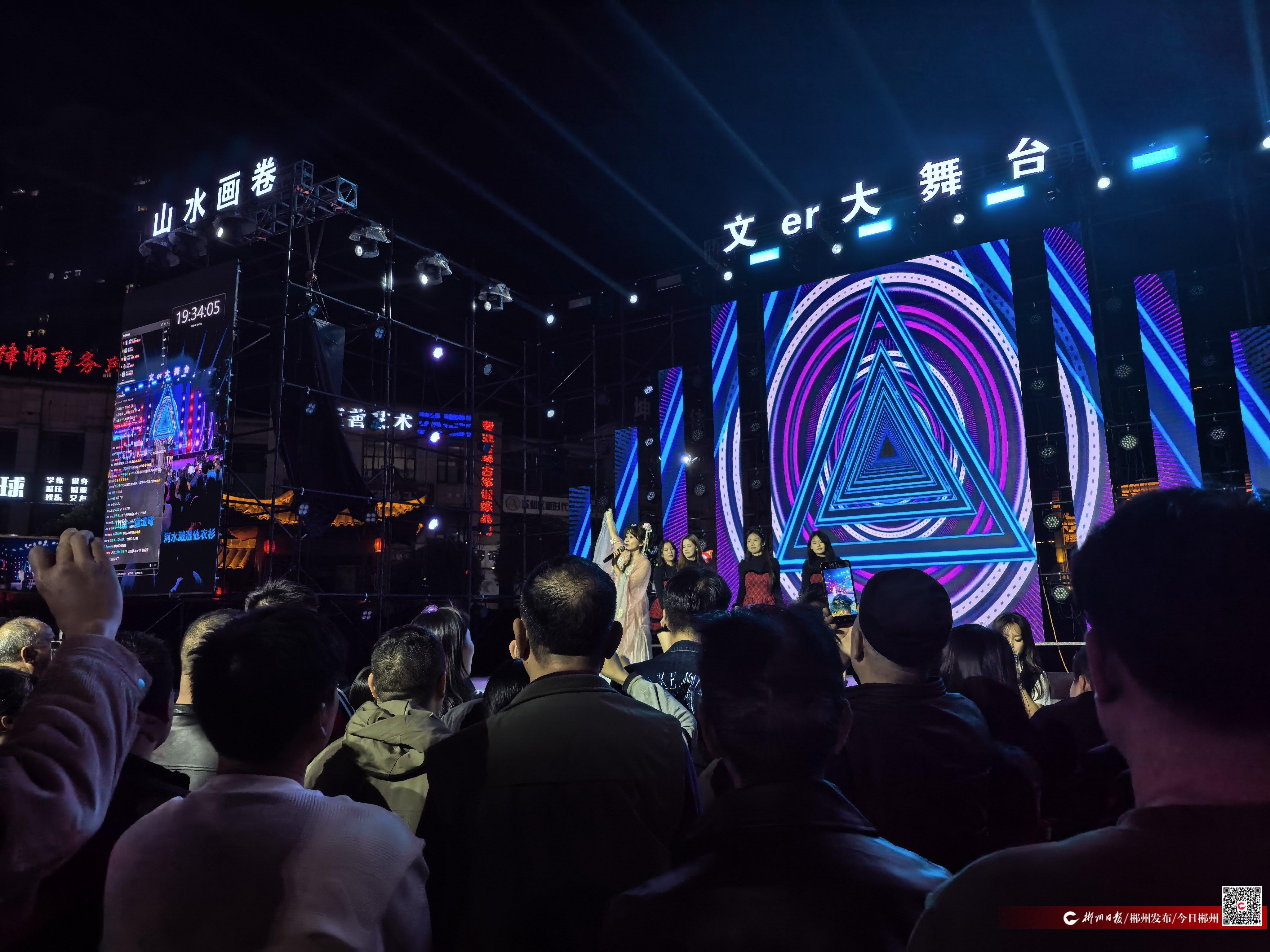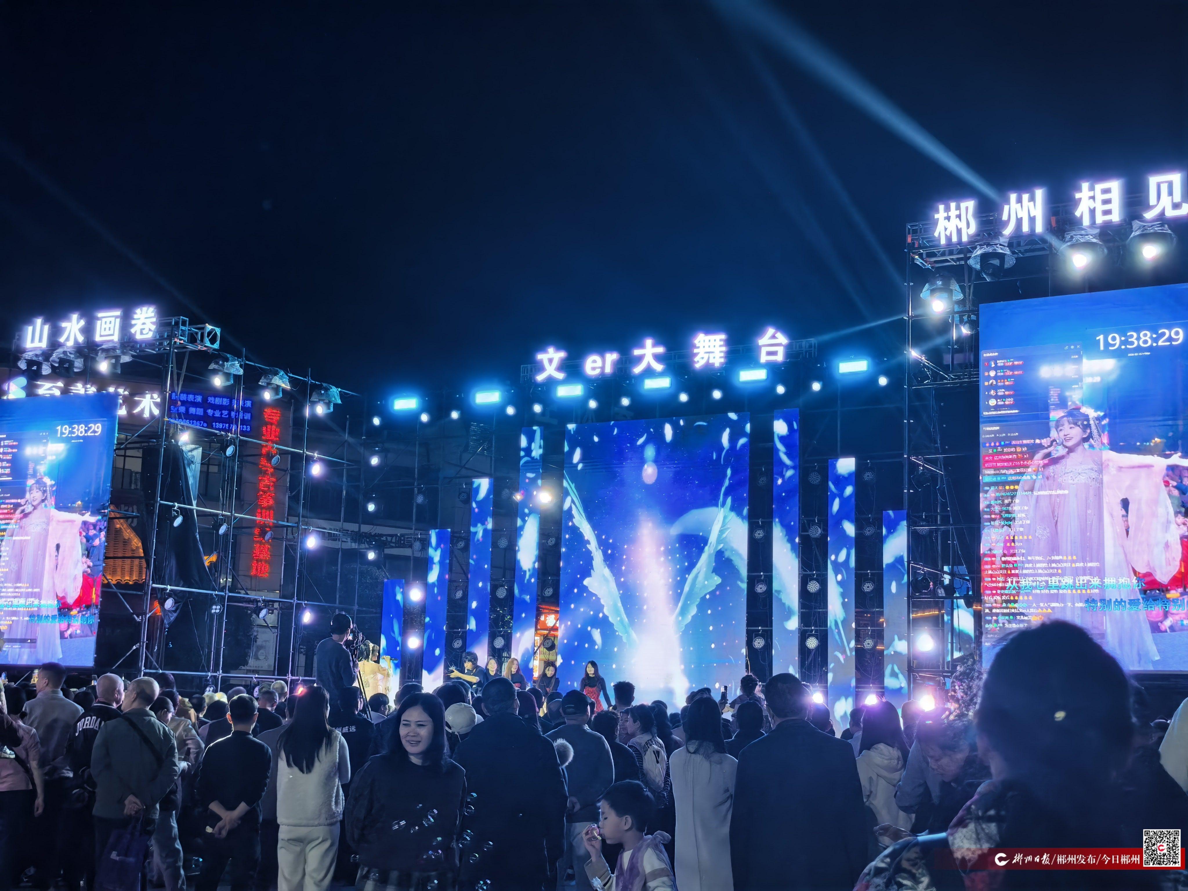 夜幕降临,苏仙福地广场早已聚满闻讯而来的市民,舞台周边的空地被挤得满满当当,里三层外三层的人群将活动现场围得严严实实。舞台上方,“山水画卷 郴州相见”“文er大舞台”的字样在灯光映照下格外醒目,两侧大屏幕同步跳动着直播间的互动留言,线上网友的祝福与线下观众的欢呼交织在一起,汇成一片欢乐的海洋。