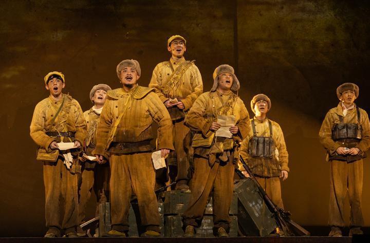 这是音乐剧《寻找李二狗》的演出剧照(2025年4月7日摄)。该剧以抗美援朝伟大历史为背景,取材自志愿军第39军116师真实故事,通过当代青年常卫国借助爷爷的回忆录穿越回1950年鸭绿江畔的舞台设定,展开两代青年的跨时空对话。2025年11月,该剧荣获第十八届文华剧目奖。