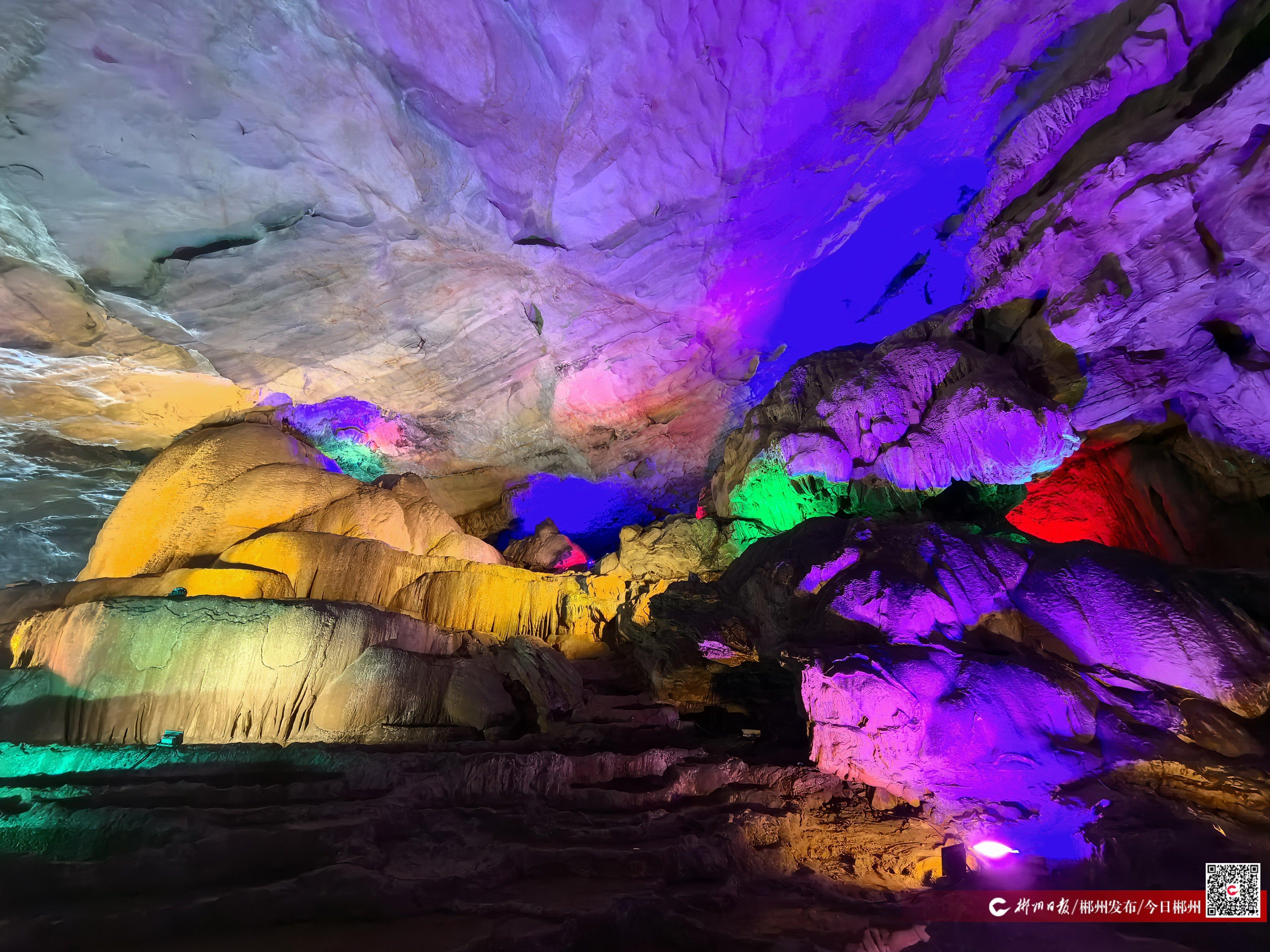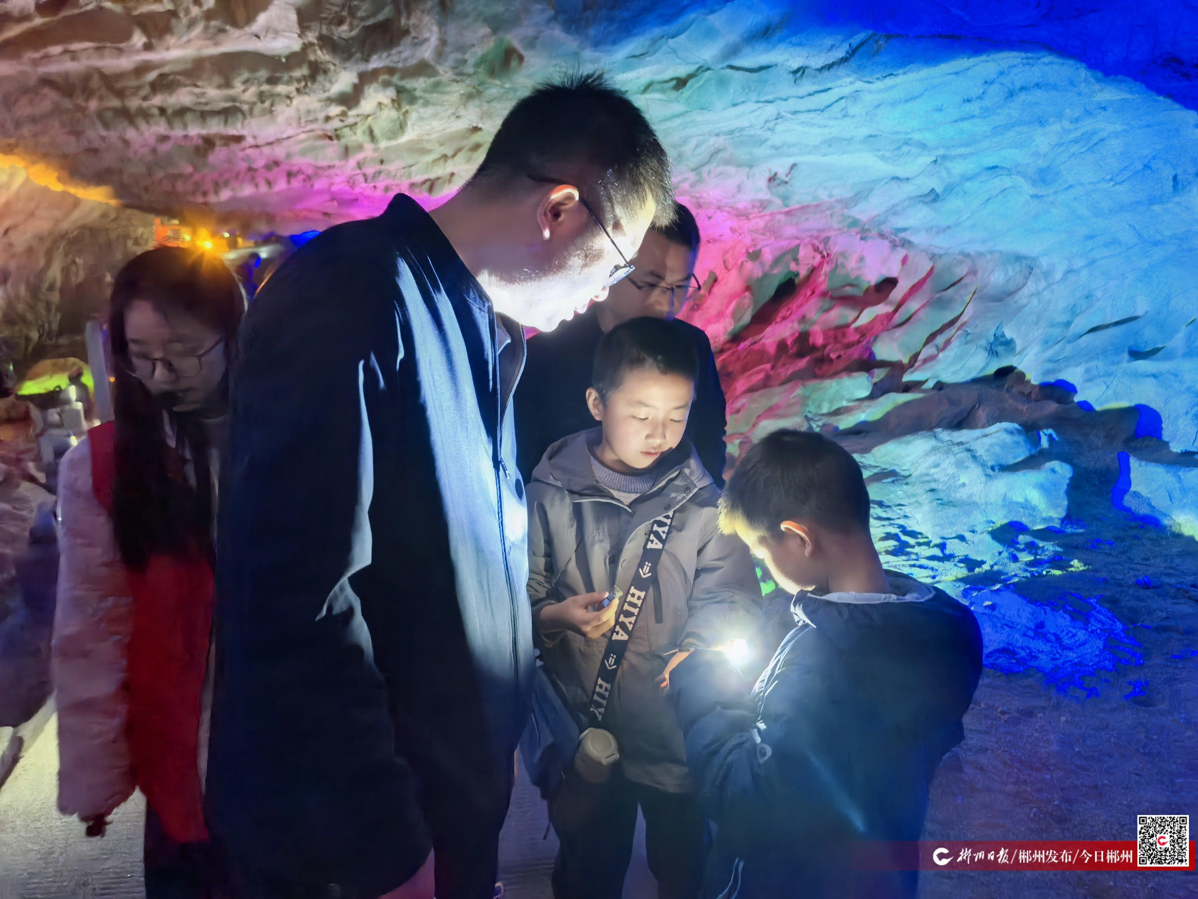 溶洞内,形态各异的钟乳石在五彩斑斓的灯光映照下熠熠生辉,吸引游客驻足观赏。范先生的孩子在欣赏溶洞景观之余,发现了一片“新世界”——他接过讲解员手中的手电筒,俯身探寻岩缝中的鹅卵石,眼神中满是好奇。