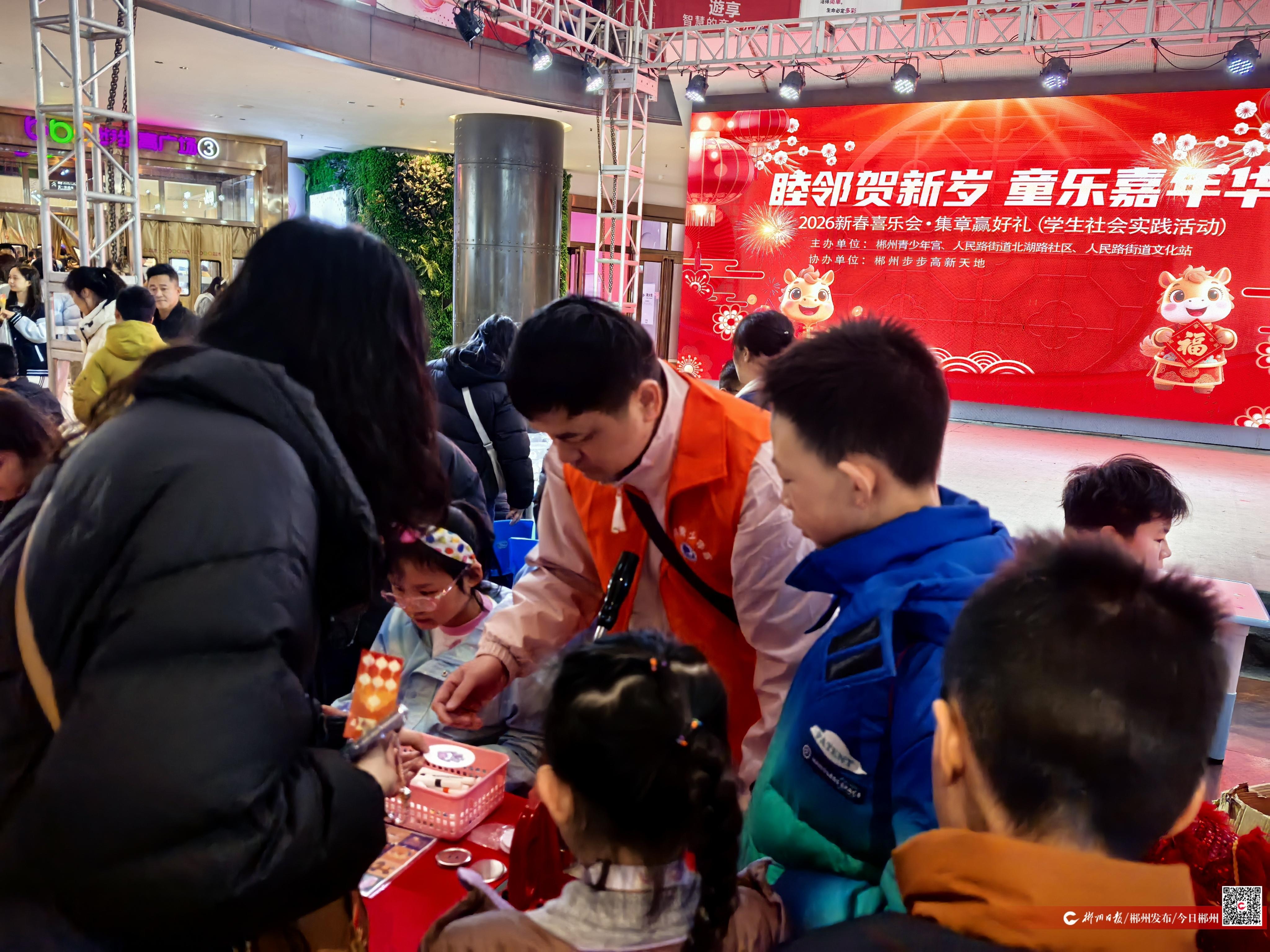 2月27日,由郴州青少年宫、人民路街道文化站、人民路街道北湖路社区联合主办,郴州步步高新天地协办的“睦邻贺新岁 童乐嘉年华”2026新春喜乐会暨集章赢好礼学生社会实践活动,在步步高新天地热闹开幕。