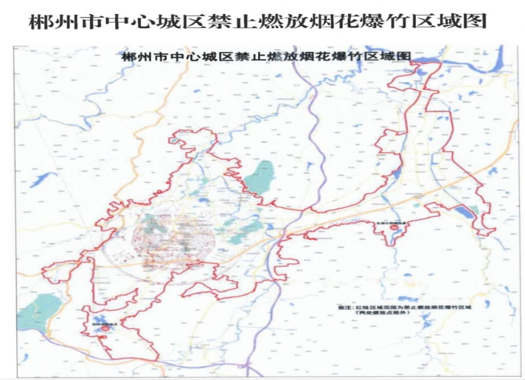 郴州市中心城区禁止燃放烟花爆竹的区域(以下简称“禁燃区”)具体为:柿竹园社区—麻田村—苏仙区农垦场—飞天山国家地质公园—郴永大道(雅市村段)—千里湖山—青年大道人民路交汇处—卜里坪村—龙女温泉景区—同心桥村—华泰城—雷大桥村—石盖塘村—田家湾村—郴州大道(王仙岭风景区段)—长卷文化旅游度假区—白露塘村—柿竹园社区所形成的对应闭合区域。