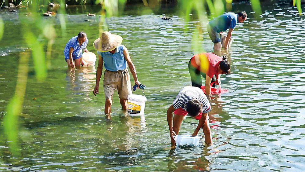 在麻溪村,村民们在水中摸嗦螺。(余际林摄)