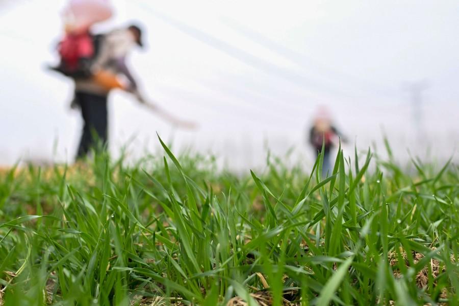 ▲2026年2月4日,农民在江苏省昆山市锦溪镇长云村麦田间喷打化肥。新华社发(王须中摄)