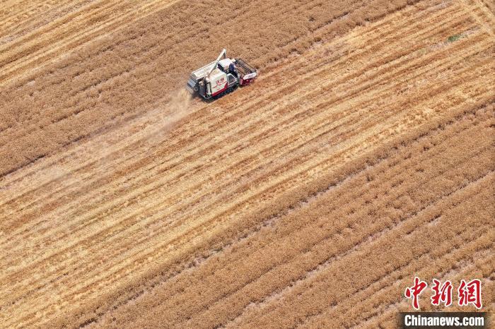 ▲资料图:江苏南京,工作人员驾驶农机在江北一处田间收割小麦。(无人机照片)中新社记者 泱波 摄