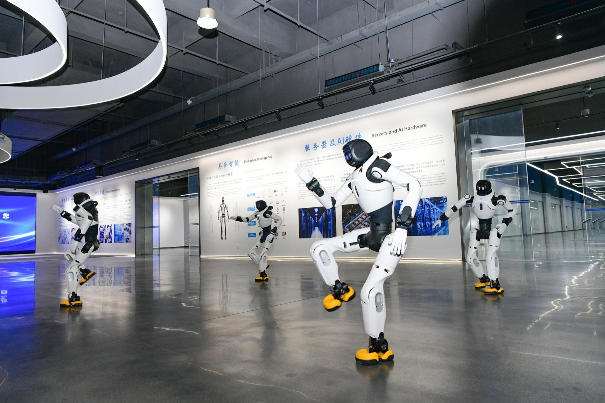 步入主展厅内,四台智能机器人整齐列阵,伴着灵动的节奏展示着高难度的舞蹈动作,科技范与未来感扑面而来。
