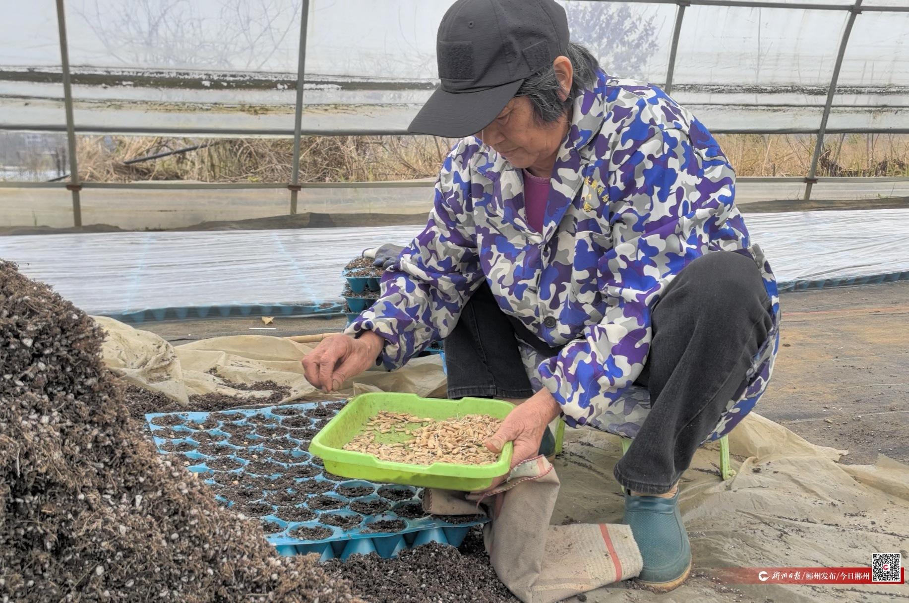 在廖海平等能人的带动下,双峰村的蔬菜产业红利实实在在地落进了村民的口袋里。在基地大棚里,70岁的曾三金坐在土堆旁,忙着在手边的穴盘里,点种,覆土。近六年,她农闲时就来这儿务工。