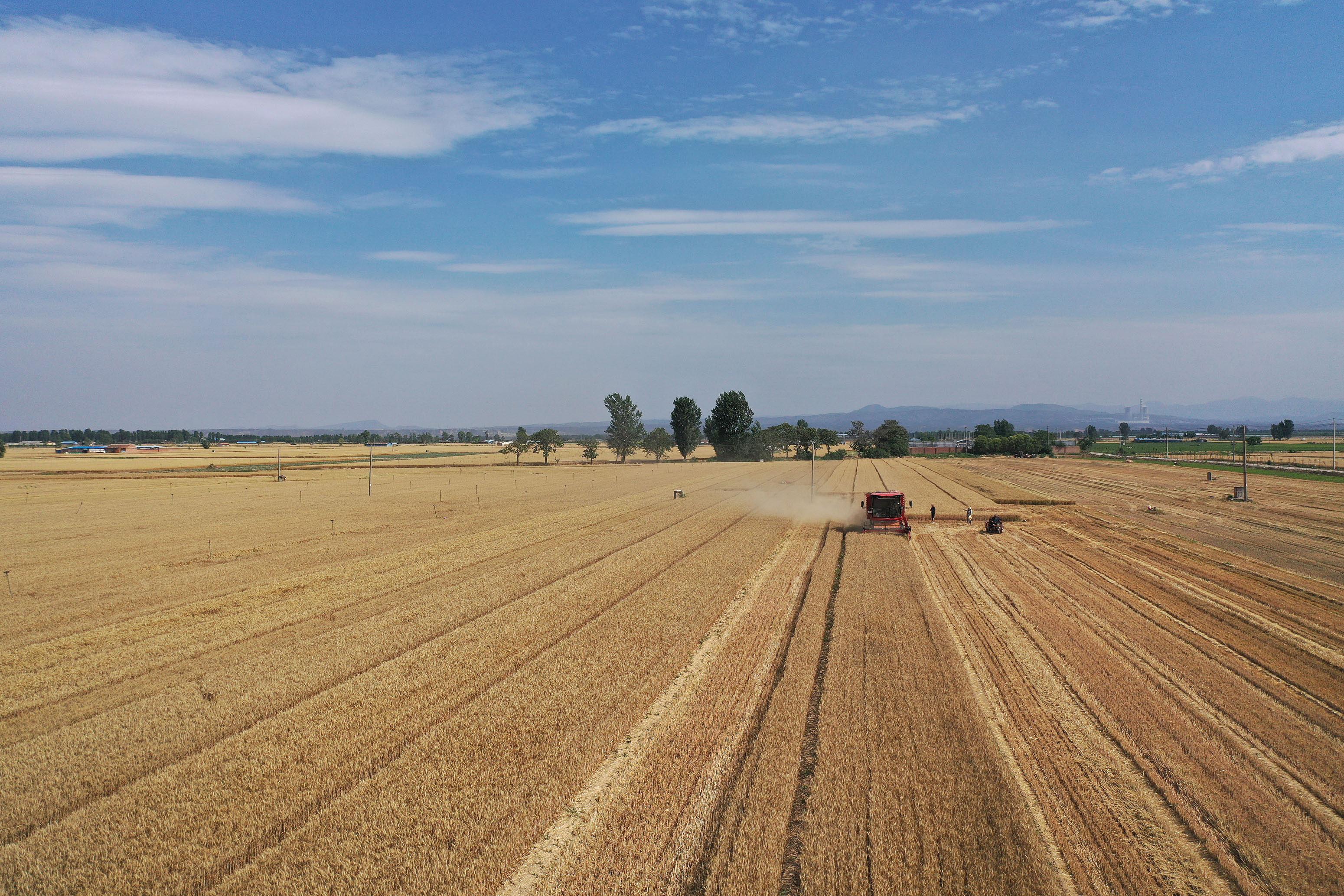 2025年6月3日,河南焦作,温县黄河街道滩王庄村农民驾驶收割机收获小麦。