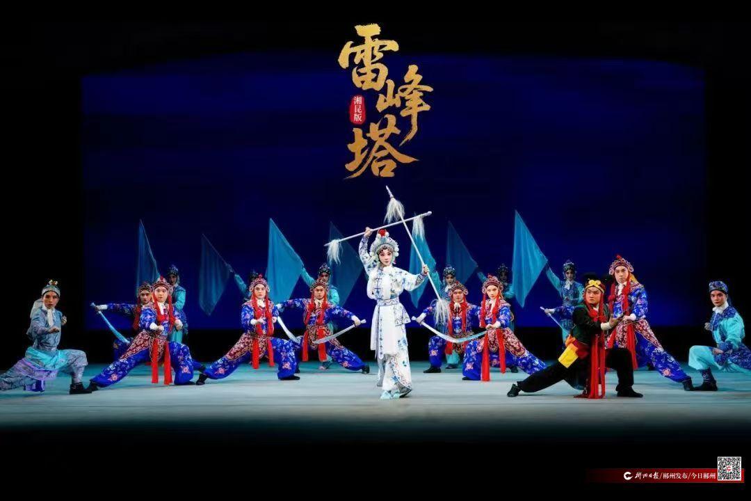 湘昆版《雷峰塔》深度融入湖湘文化特质,语言上以湘南官话为基底,丑角、副角采用郴州官话结合中州韵,创新性地加入湘南民歌“加滚加衬”技法,使吐字更刚、咬字更重、节奏更紧、音调更亮;叙事上重塑白素贞形象,如《端阳》一折中,把她饮雄黄酒的动机从“害怕露怯”改为“为爱赴险”的主动选择,将悲情角色升级为果敢反抗者,体现湖湘人“霸蛮”“不服输”的精神。演出融合声光电技术与传统武戏特技,通过集体密集开打、翻跌与特技配合营造磅礴气势,获得现场观众的热烈反响。
