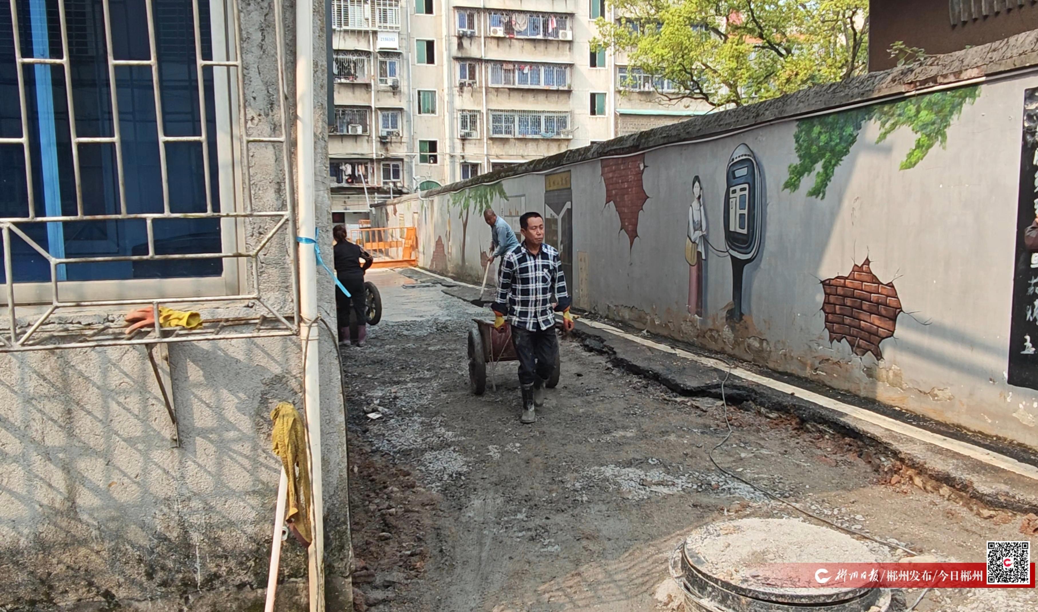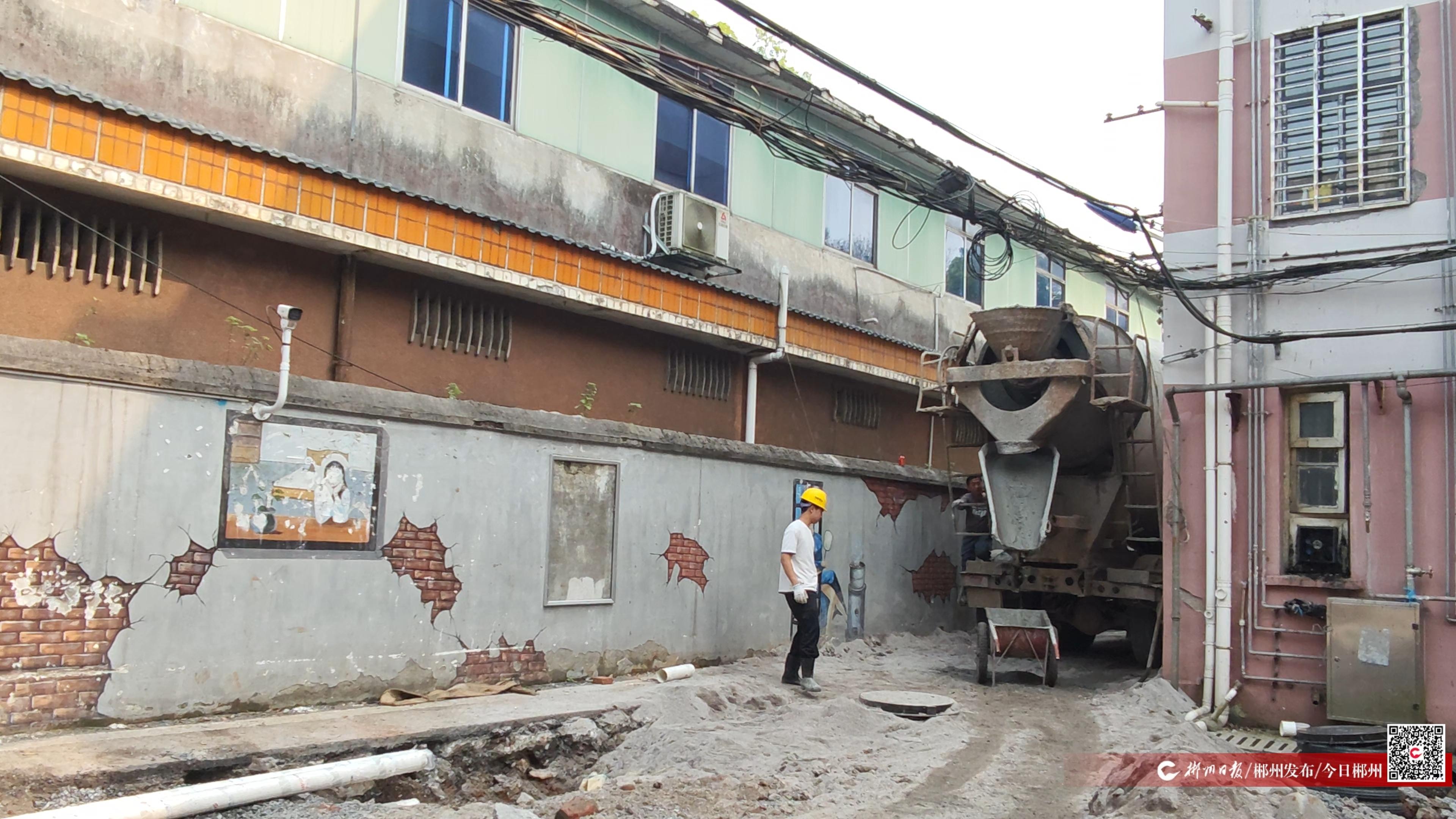3月26日,记者在南岭大道万花冲烟草小区8栋看到,该栋居民楼右侧道路较为狭窄,施工车辆将道路阻断,路边堆放着管道、砂石等材料,部分工人正在忙碌作业。