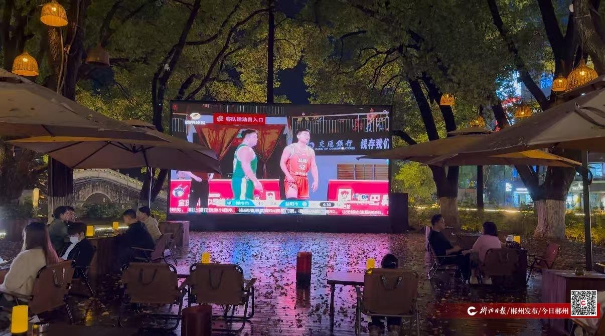 而在雨后的北湖公园,水月洲云岛营地同样聚起了观赛的人群。市民们三三两两围坐在一起,目光紧紧锁着大屏,凝神收看湘BA的精彩转播。
