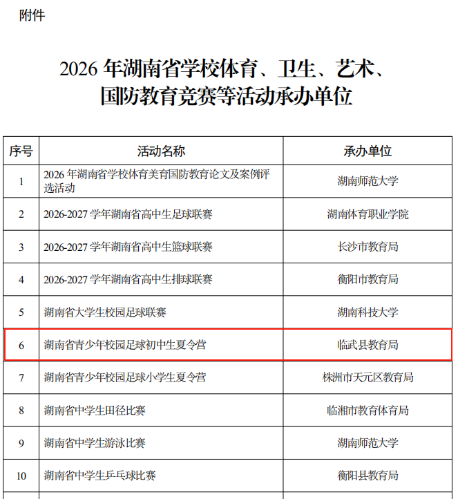 近日,笔者从湖南省教育厅获悉,临武县成功获得2026年湖南省青少年校园足球初中生夏令营承办资格。这是对该县校园足球发展成效的高度认可,也是其推动体教深度融合的重要契机。