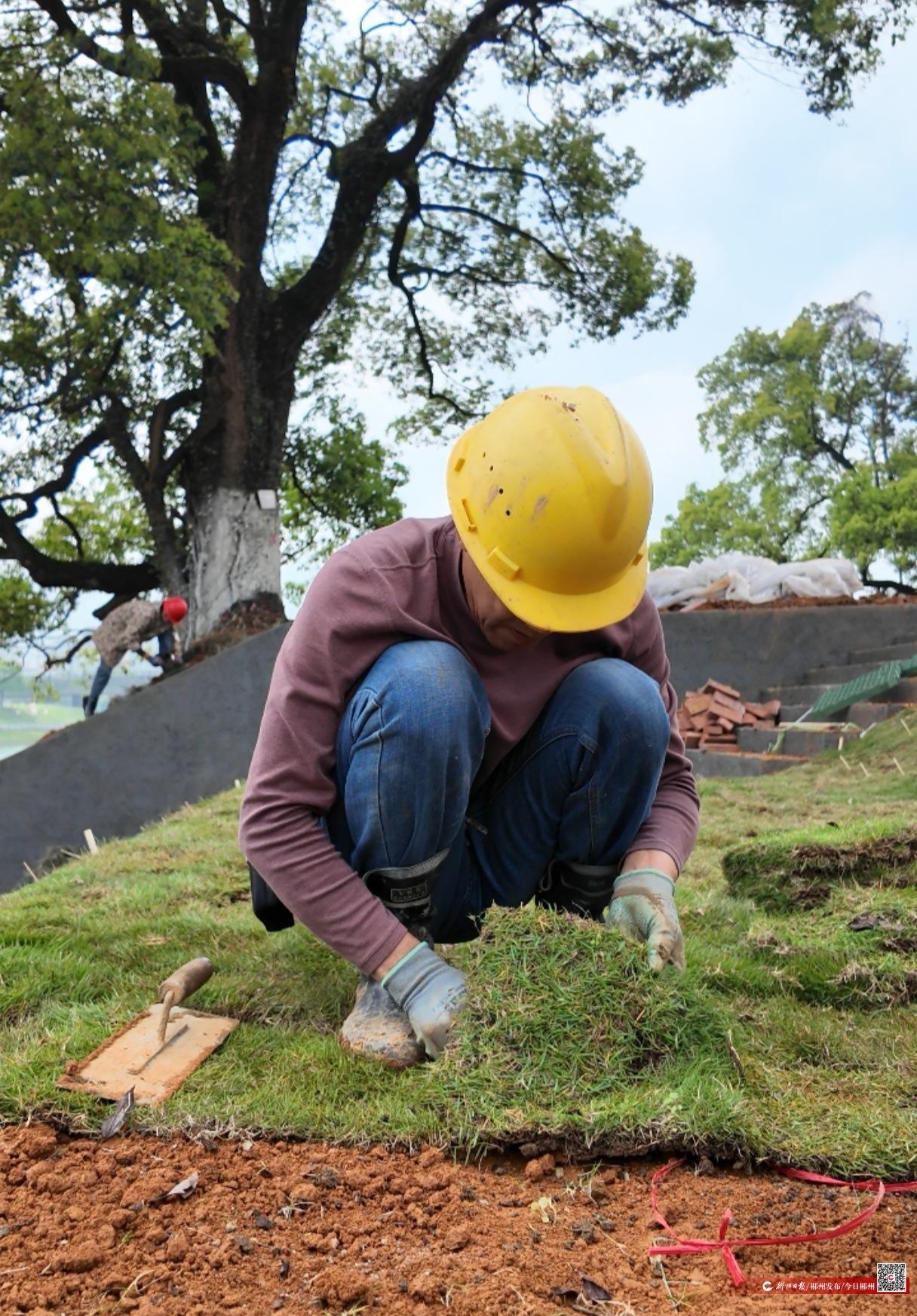 施工现场,工人们分工协作,抓紧铺设最后一节台阶的草皮。他们说:“铺草皮很快的,只要材料够,今天就能铺好。”