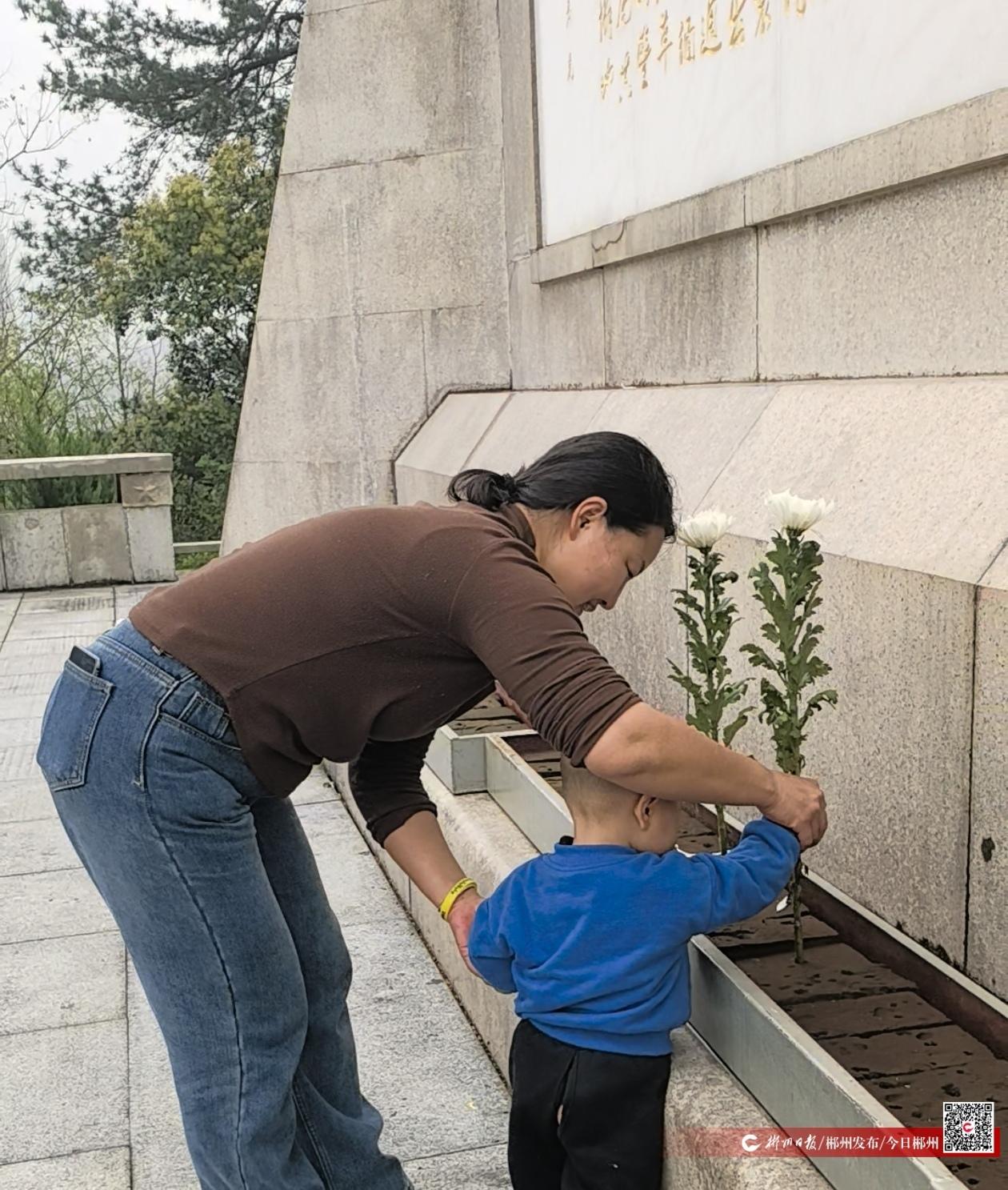 孩子在妈妈的引导下,踮起脚尖,把白菊轻轻地放在塔座前。放完一朵,又回头拿妈妈手里的那一朵,也放上去。然后,他学着妈妈的样子,对着纪念塔鞠了一躬。动作稚拙,却格外认真。“家风就是一代做给一代看。我带他来,是想让他知道,这些革命烈士是值得我们敬重、感恩的人,因为有他们,才有我们今天的幸福生活,等他长大了,他会懂的。”李平珍说。