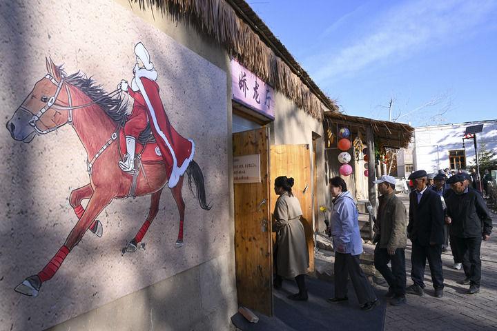 2026年4月3日,人们排队进入新疆昭苏县灯塔知青馆娇龙厅献花,追忆贺娇龙同志为当地经济社会发展、文旅品牌打造、农牧民增收致富作出的贡献。新华社记者 胡虎虎 摄