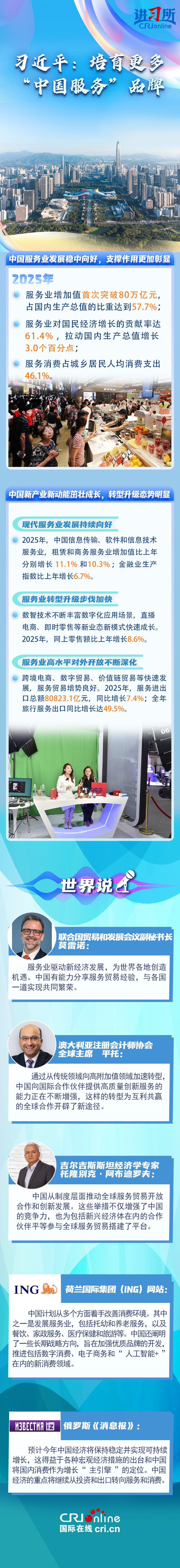 中国全国服务业大会4月7日至8日在北京召开。中共中央总书记、国家主席习近平近日就中国服务业发展作出重要指示,强调“突出需求牵引、改革攻坚、科技赋能、开放合作,深入实施服务业扩能提质行动,推进生产性服务业向专业化和价值链高端延伸,促进生活性服务业高品质多样化便利化发展,培育更多‘中国服务’品牌,努力开创服务业高质量发展新局面。”
