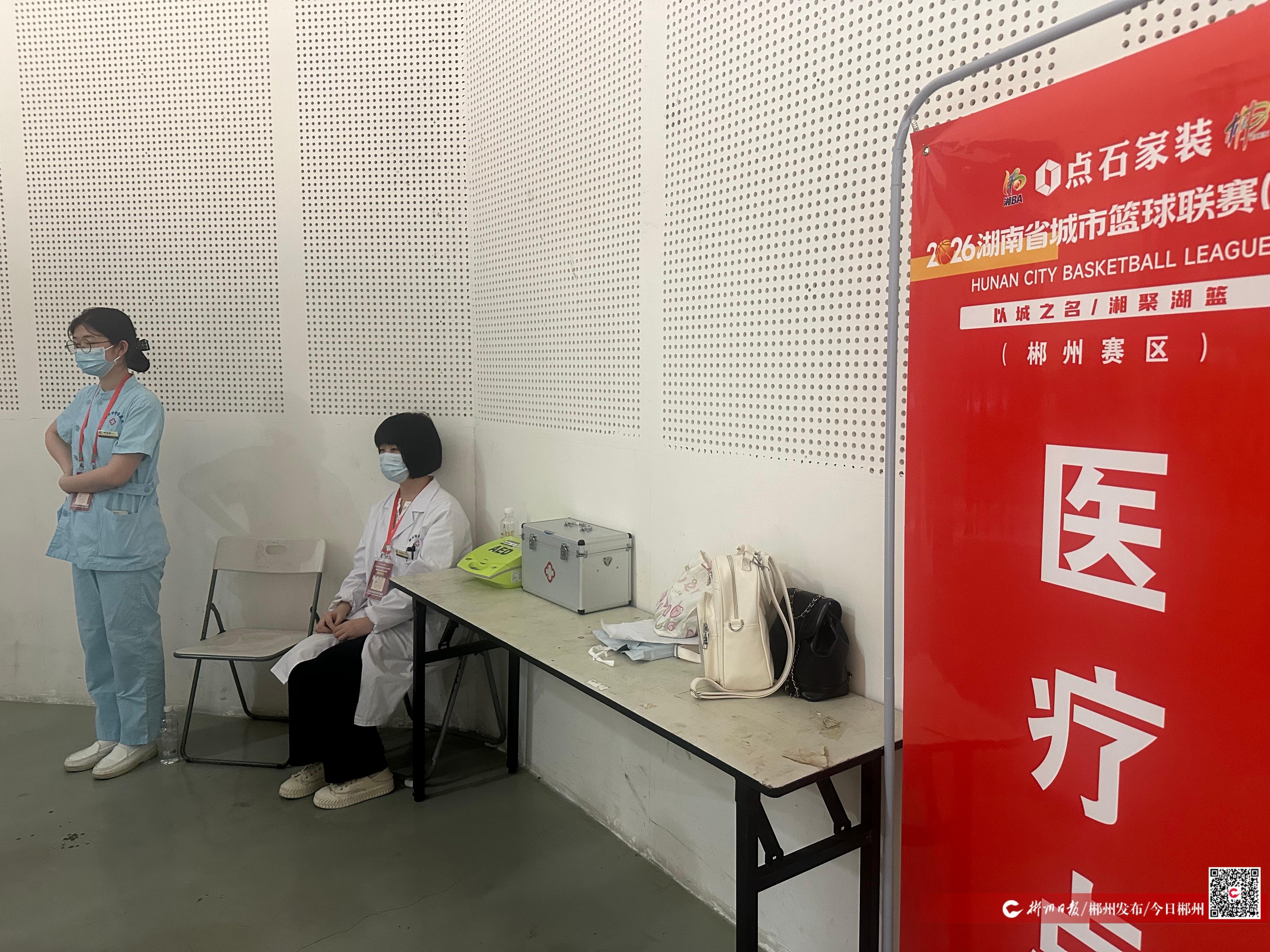 穿过检票口进入看台,郴州市中医院的医护人员已经就位。负责调度医疗保障的医务科干事欧阳莹介绍,医院在内场和看台各安排了一名医生和一名护士,看台区域同样配备了应急常用药品和自动除颤仪(AED)。“篮球比赛对抗激烈,看台上观众多,我们提前做好了应对突发状况的准备。”欧阳莹说,从跌打损伤到心脏骤停,每一类急症都有对应的处置方案,确保无论观众还是球员,都能在第一时间得到专业救治。