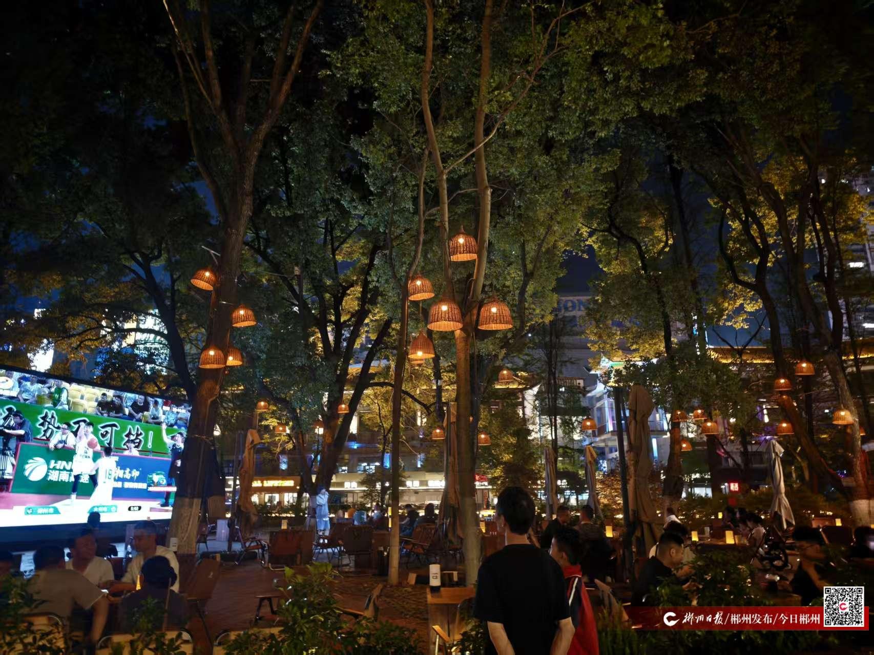 同样,在欢乐海岸街区,广场大屏前也围坐着不少观看的市民。夜晚的广场微风徐徐,有人端着还没吃完的宵夜驻足仰望,有人带着孩子席地而坐,一边看球一边给孩子讲解战术。人群中,最引人注目的是一位头发花白的老球迷,他坐在轮椅上,被家人小心翼翼地推到最佳观赛位置。老人的目光始终追随着屏幕上的每一个跑动、每一次传球。他指着大屏幕,眼里满是感慨:“我年轻时候就喜欢打篮球,那时没有条件看球赛,现在家门口就能体验,特别高兴。”话音刚落,郴州队命中一记三分,老人激动地拍起轮椅扶手,周围的年轻人也纷纷鼓掌欢呼。