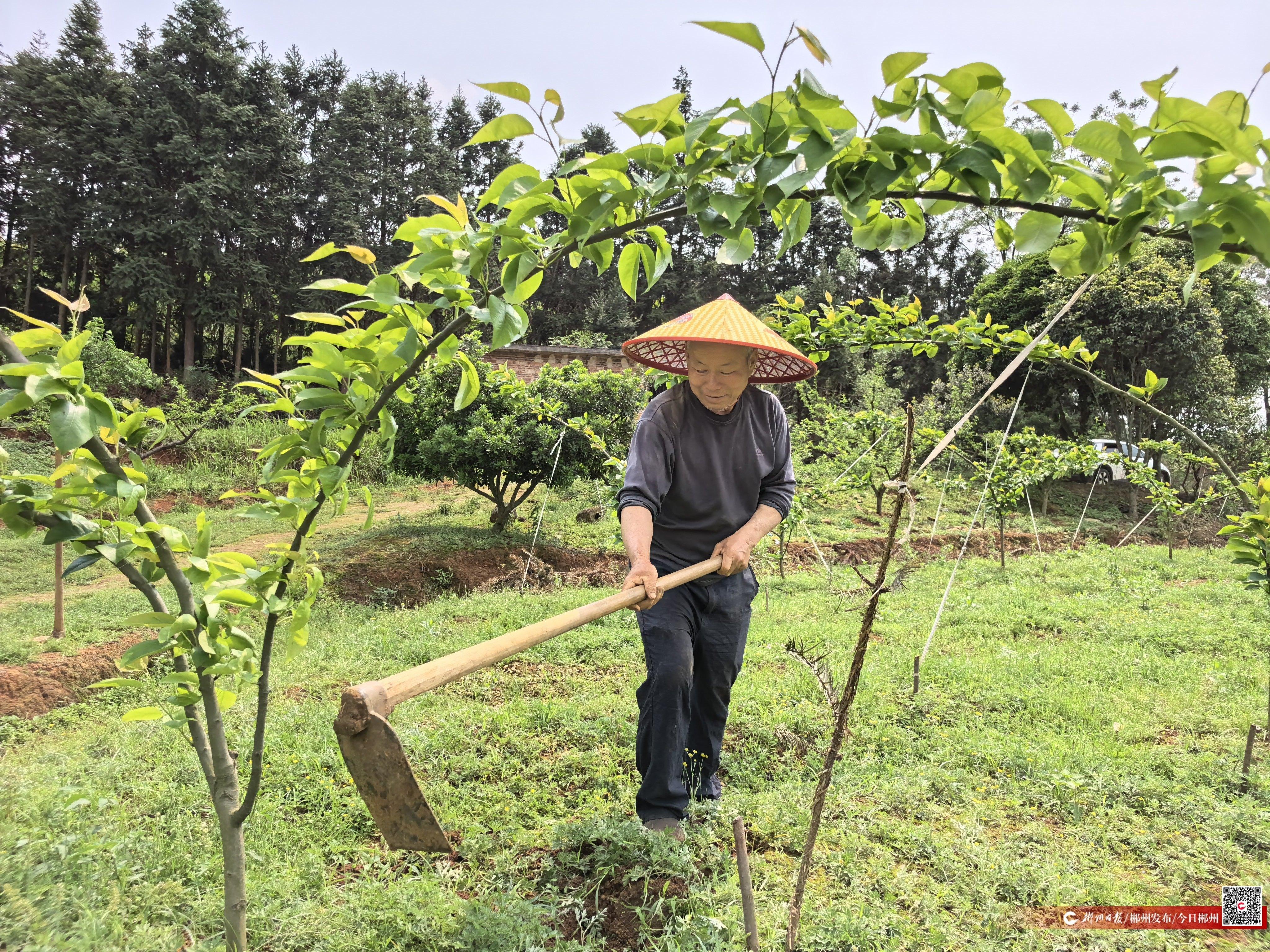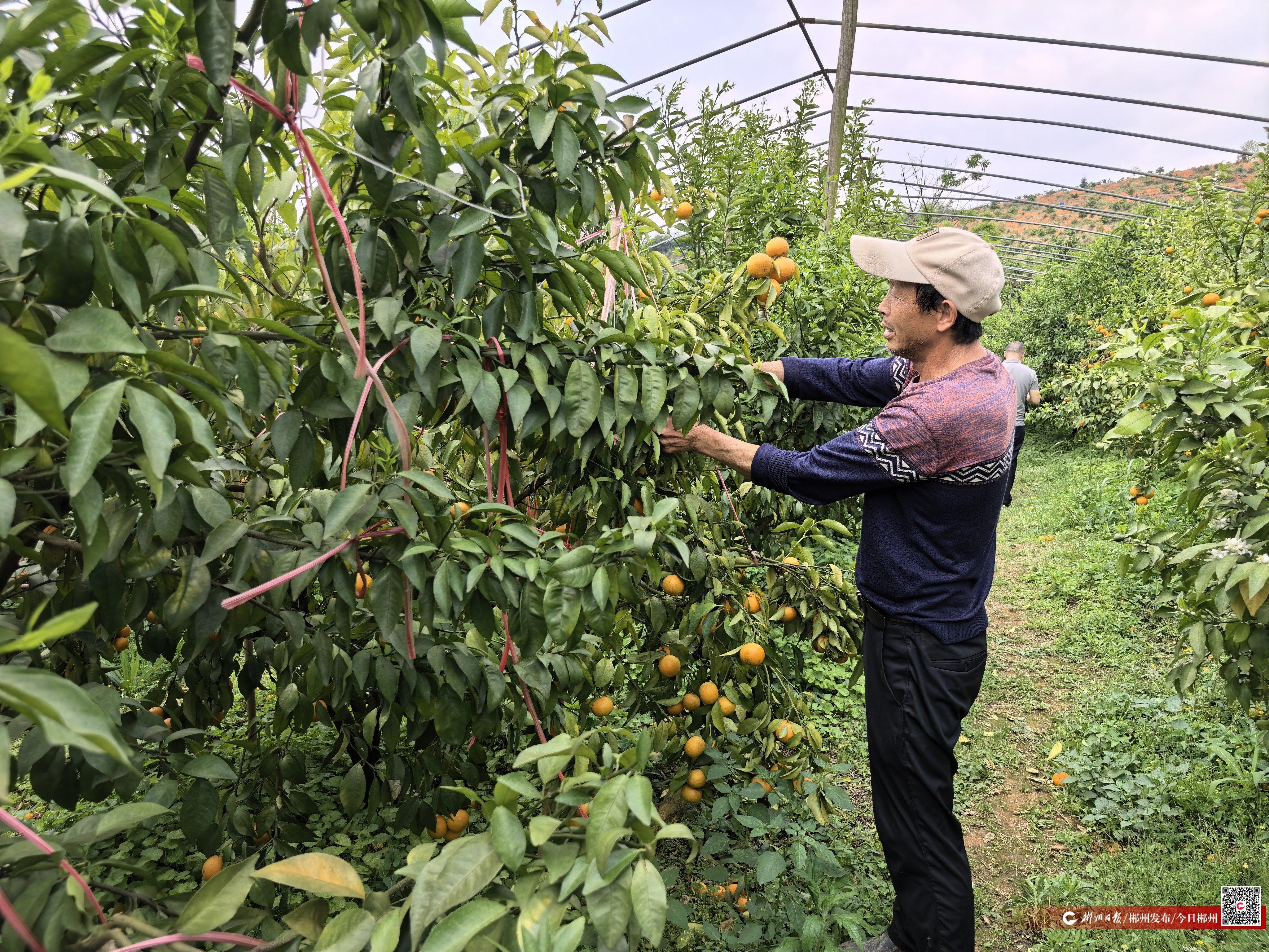 4月9日上午,在宜章县笆篱镇黄土岭村塘贤冲组,沃柑采摘进入尾声,60岁的脱贫户谭运祥想到果园再挑一挑。
