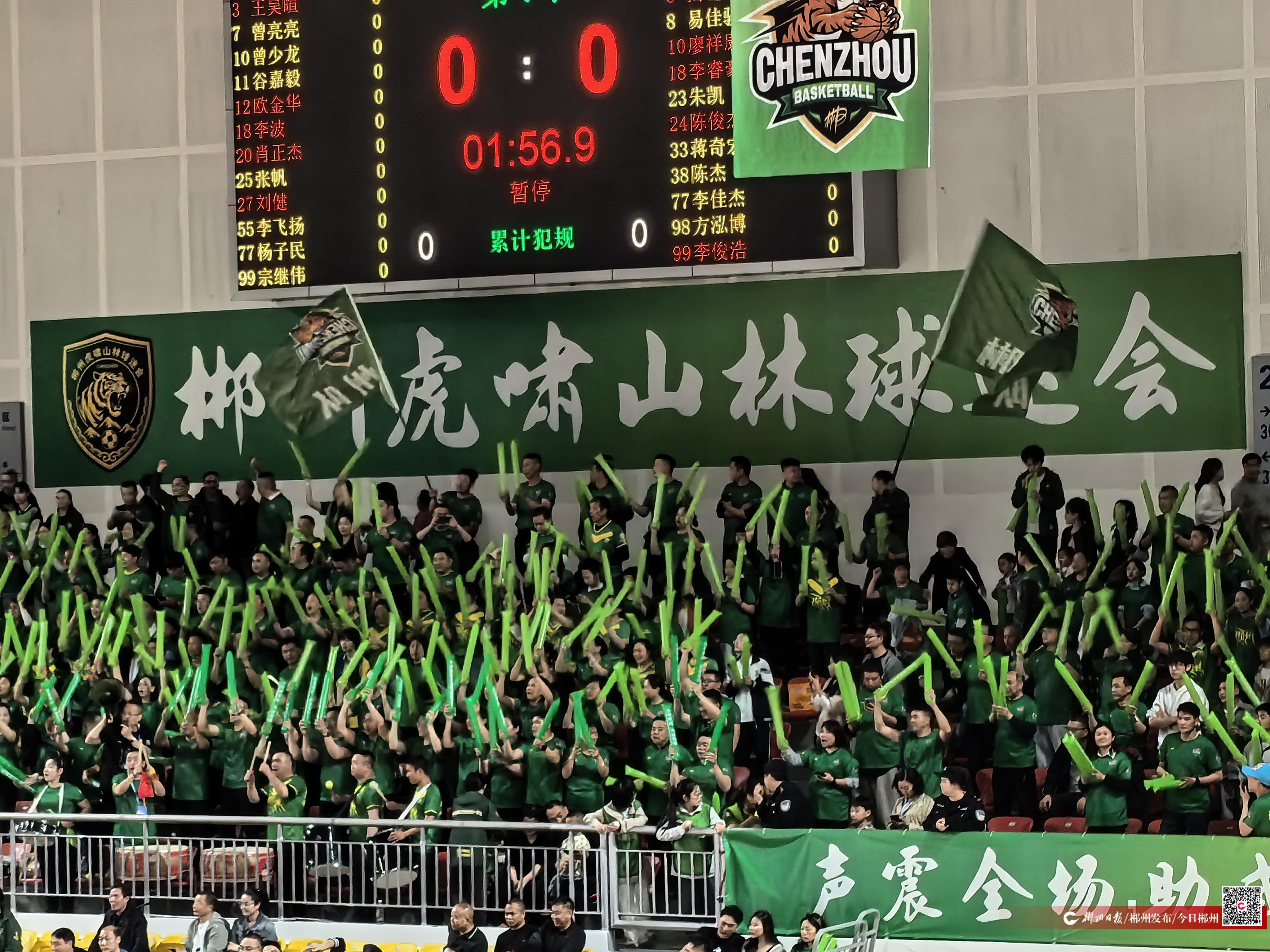 7时30分,比赛正式开始。首节暂停时,看台上球迷方阵自发唱响郴州队队歌,旋律朗朗上口、催人奋进。嘹亮的歌声与“郴州蹬起”的呐喊声此起彼伏,交织成强大的助威声浪。