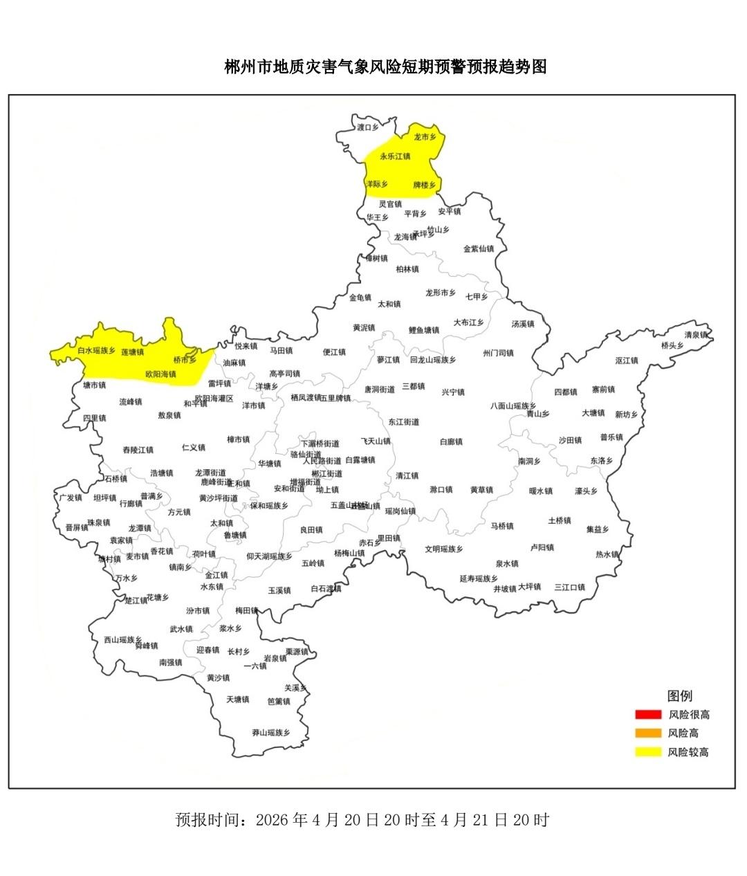 4月20日下午,记者从市自然资源和规划局与市气象局了解到,根据地质灾害成灾规律、孕灾条件,受较强降雨影响,市自然资源和规划局与市气象局联合会商得出如下结论:自4月20日20时至4月21日20 时,我市安仁县局地、桂阳县局地发生突发性地质灾害风险较高(黄色预警)。黄色预警区域:安仁县(洋际乡、龙市乡、永乐江镇、牌楼乡)、桂阳县(白水瑶族乡、莲塘镇、欧阳海镇、桥市乡),详细见图。