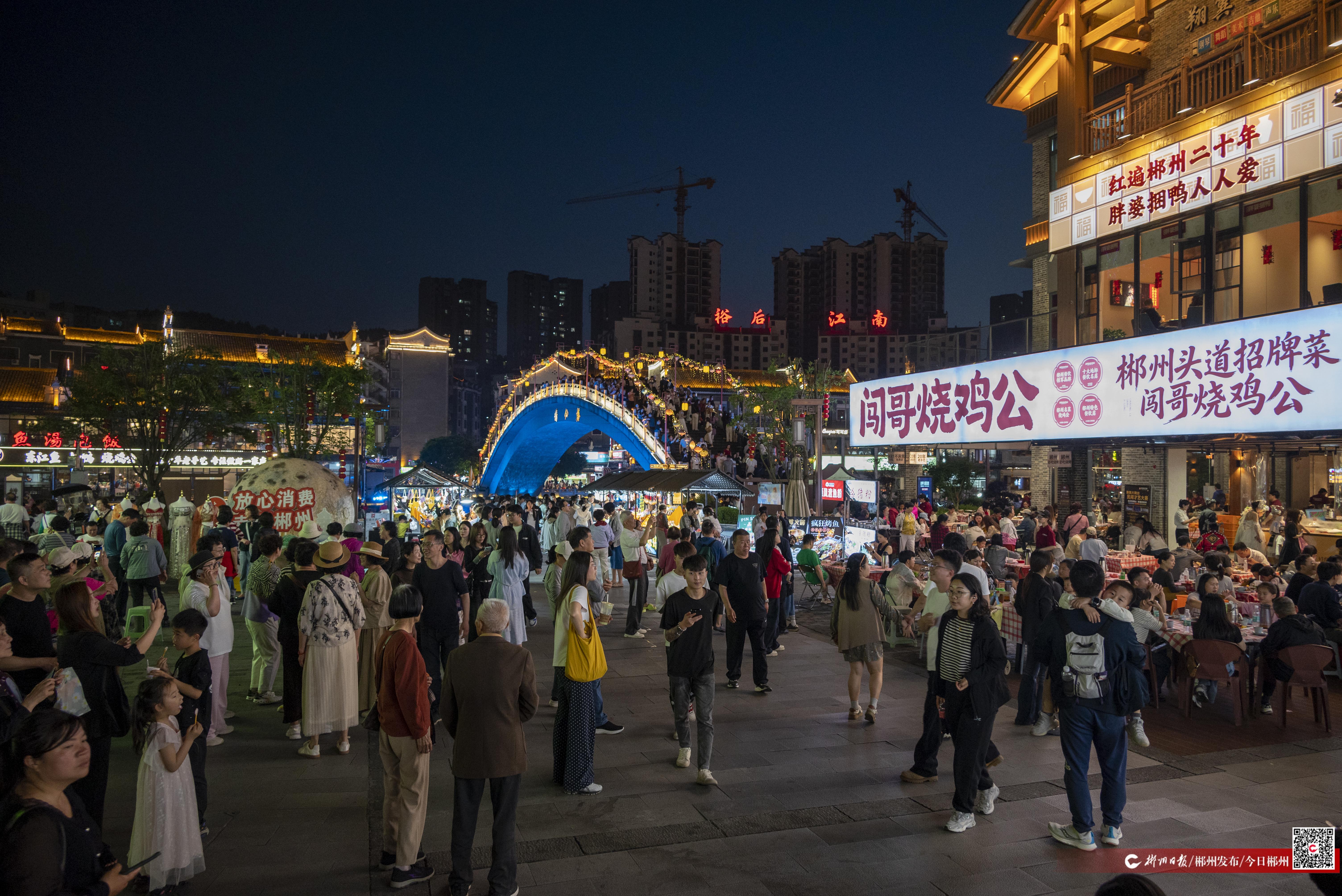 4月18日晚,这条千年古街迎来了又一个周末之夜,数十辆旅游大巴接连载来游客。沿街的餐饮店里座无虚席,旅拍店内等着妆造的游客排起长队,鹊仙桥上人潮涌动——这样一幅熙熙攘攘的夜市图景,在郴州已是常见。