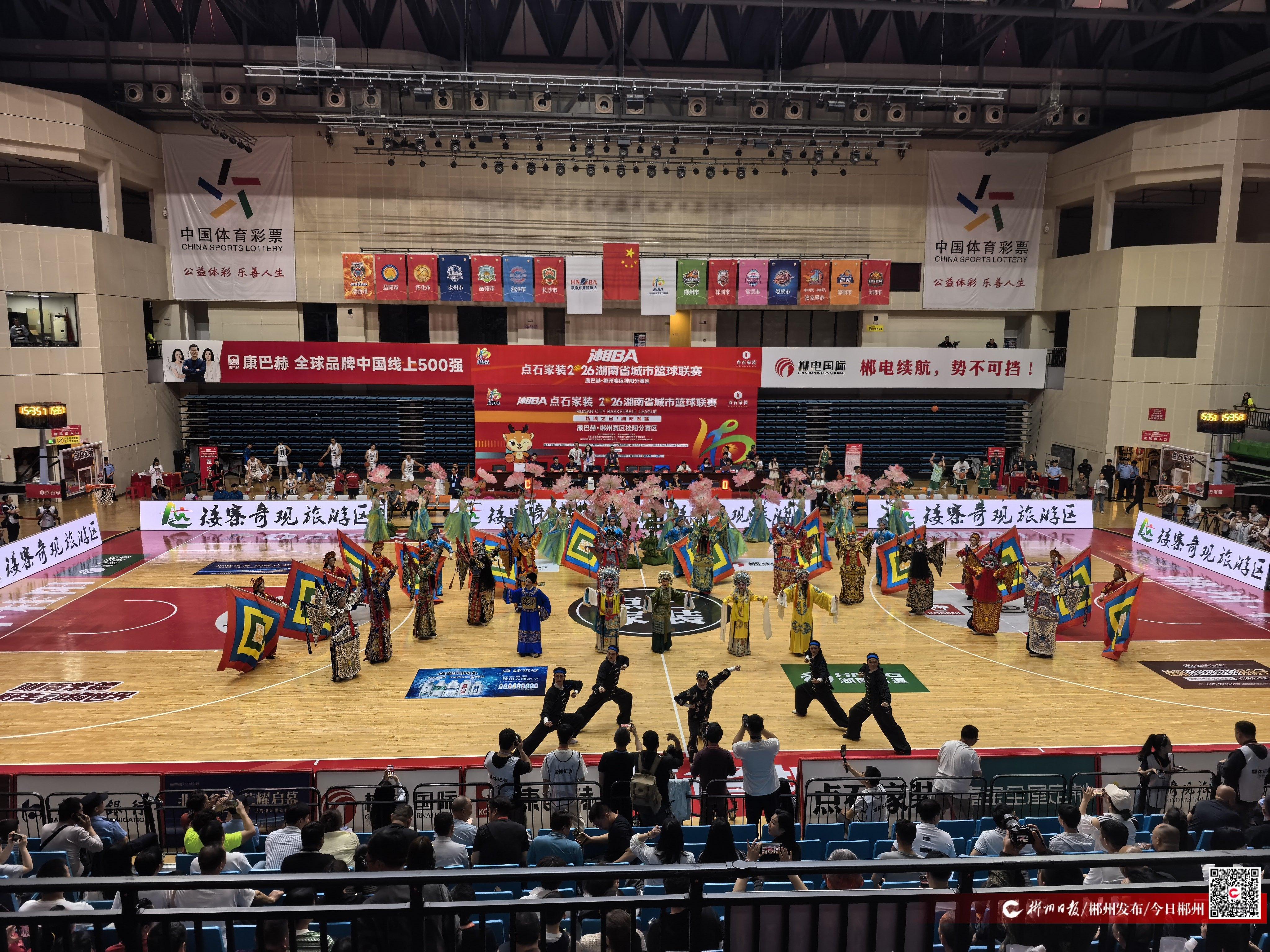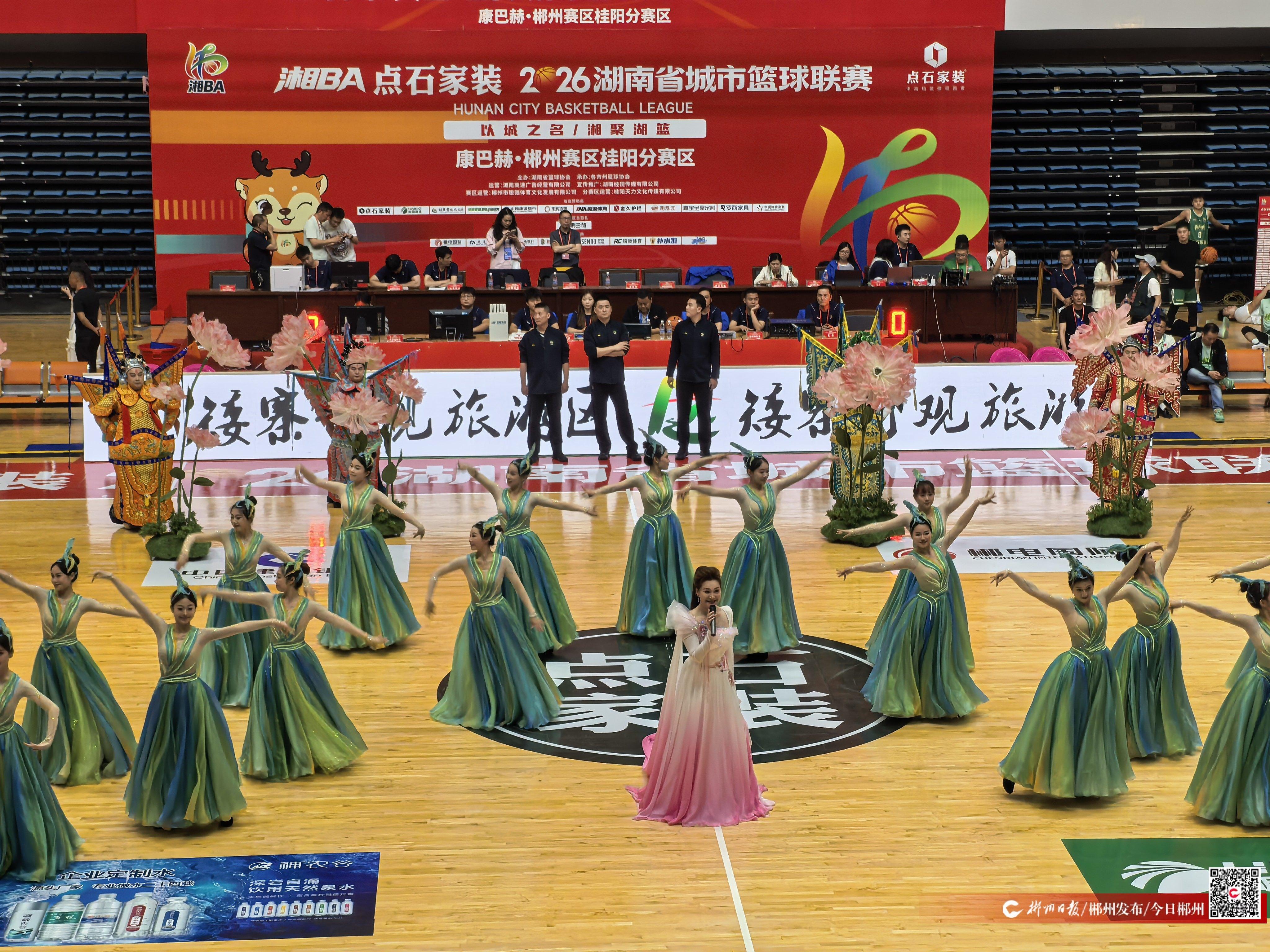 4月26日晚,桂阳县全民健身中心,湘BA郴州赛区战幕将启。19时12分,开赛哨声未响,一段湘剧声腔先声夺人——《我是中国人》的锣鼓丝弦在篮球馆里骤然响起。